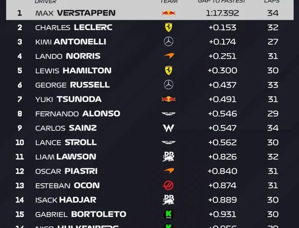 En la segunda colocación finalizó Charles Leclerc, quien mantuvo el ritmo competitivo de Ferrari y logró quedarse apenas por detrás del líder, aunque con una diferencia que dejó en evidencia la superioridad del neerlandés. El tercer puesto fue para una de las grandes promesas a seguir del fin de semana: Andrea Kimi Antonelli. El joven piloto italiano de Mercedes, que atraviesa su primera temporada completa en la categoría, sorprendió por su consistencia y demostró estar a la altura de los grandes nombres del campeonato.
