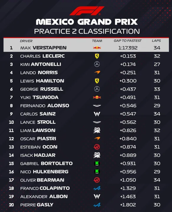 El neerlandés Max Verstappen volvió a marcar el rumbo en la Fórmula 1 y se adueñó del primer lugar en la segunda práctica libre del Gran Premio de México, disputado en el Autódromo Hermanos Rodríguez.