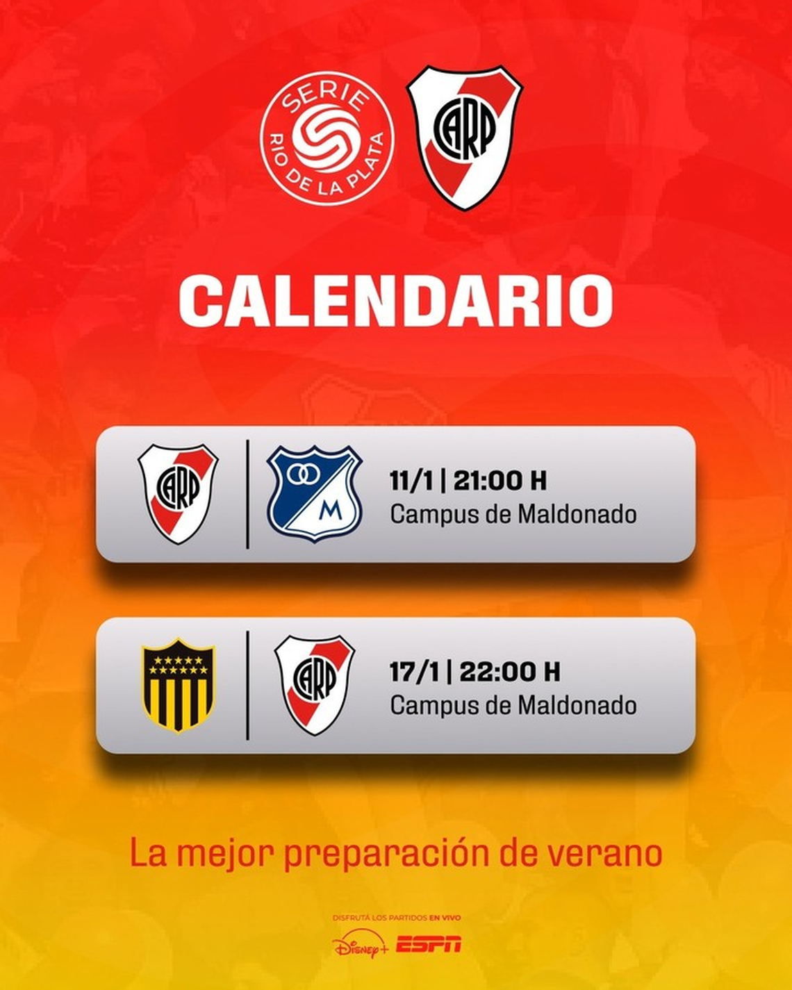 El equipo de Marcelo Gallardo se enfrentará a dos grandes de Sudamérica: el domingo 11 de enero, a las 21, se medirá ante Millonarios de Colombia, mientras que el sábado 17, a las 22, chocará con Peñarol de Uruguay. Ambos partidos serán en el Campus de Maldonado.