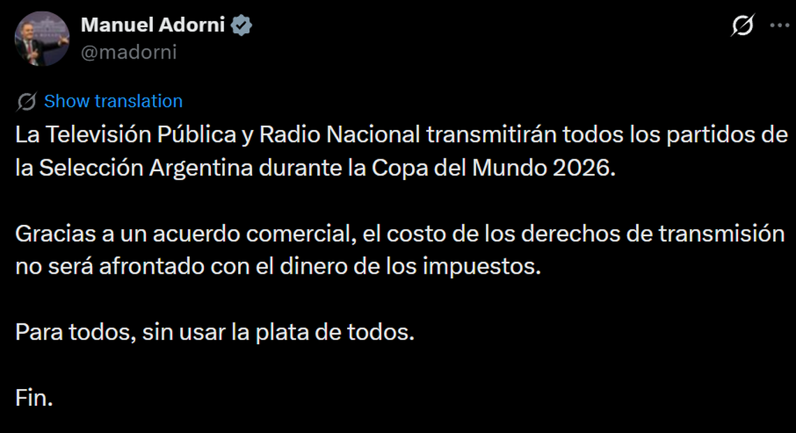 El jefe de Gabinete, Manuel Adorni, confirmó este lunes que la TV Pública y Radio Nacional “transmitirán todos los partidos” de la Selección argentina en el Mundial México, Estados Unidos, Canadá 2026 para que todos puedan ver los partidos.
