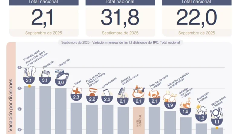 Las dos divisiones que registraron las menores variaciones en septiembre de 2025 fueron Recreación y cultura (1,3%) y Restaurantes y hoteles (1,1%).