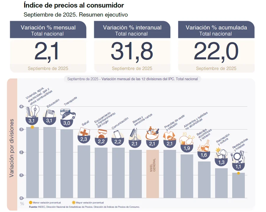 El Instituto Nacional de Estadística y Censos (INDEC) informó este martes que la inflación de septiembre de 2025 fue del 2,1%.