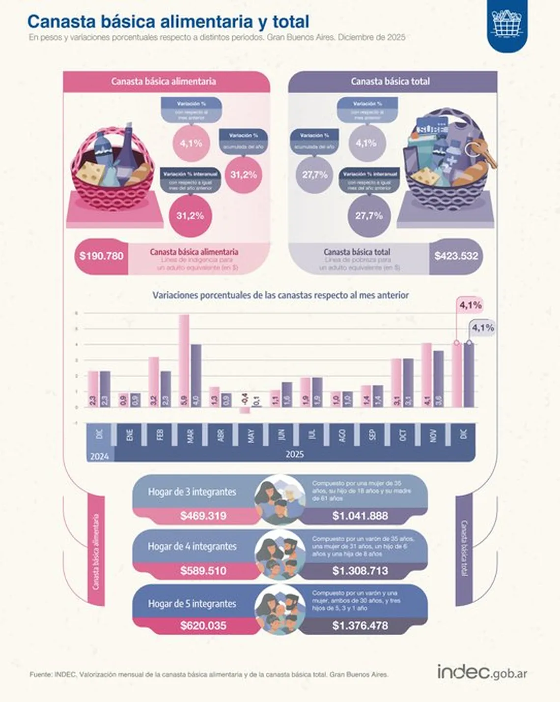 En tanto, la canasta alimentaria, que sirve para estima la indigencia, también se elevó 4,1% y acumuló un alza del 31% en el 2025 según lo informado por el Indec.