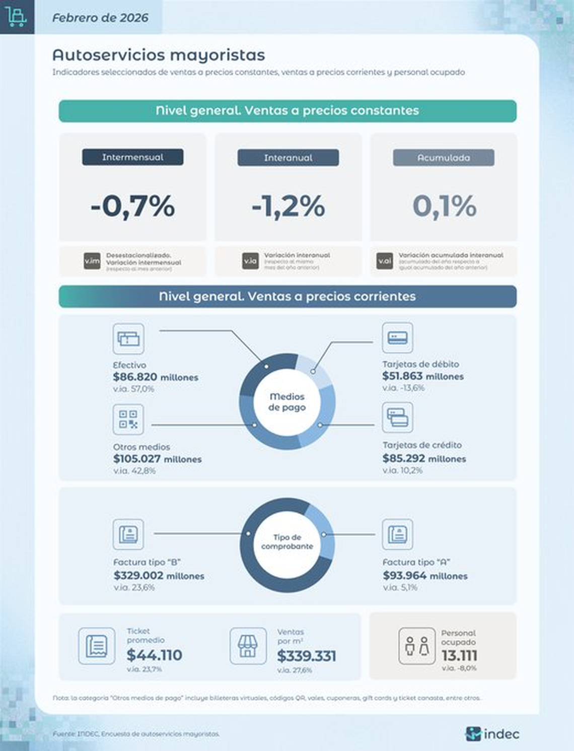 Las ventas en supermercados cayeron 3,1% interanual en febrero de y subieron apenas 0,3% respecto a las de enero, informó el Instituto Nacional de Estadísticas y Censos (Indec). De esta forma, el acumulado en el primer bimestre del año presentó una disminución de 2,1% respecto a igual período de 2025.