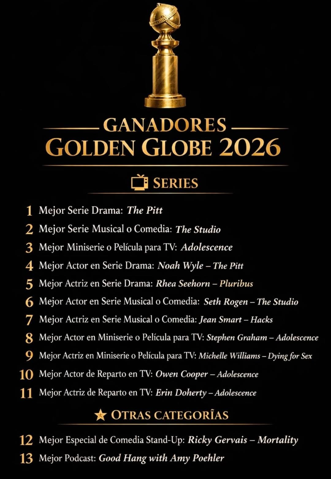 Todos los ganadores de los Globos de Oro 2026