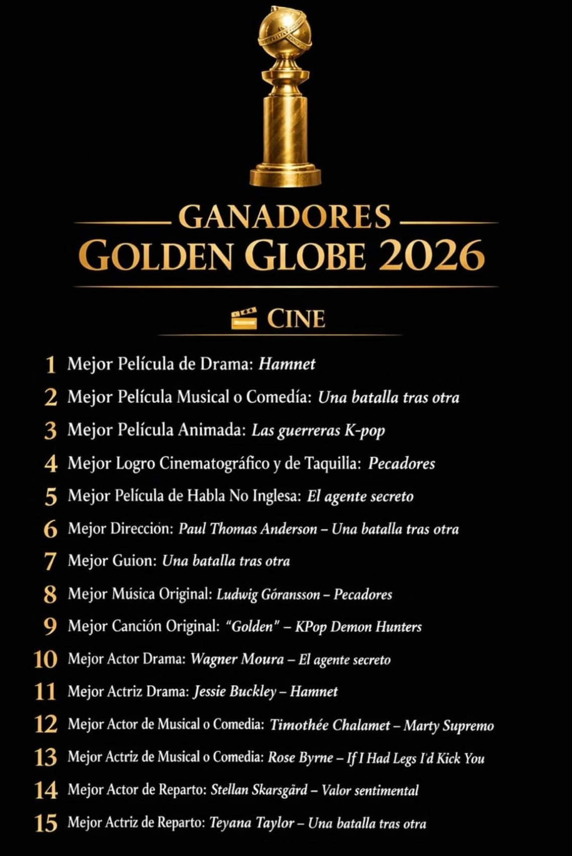- Mejor actriz dramática: Jessie Buckley, «Hamnet». Que superó a Jennifer Lawrence en «Mátate, amor», Renate Reinsve en «Valor Sentimental», Julia Roberts en «Cacería de brujas», Tessa Thompson por «Hedda» y Eva Victor en «Sorry, Baby».