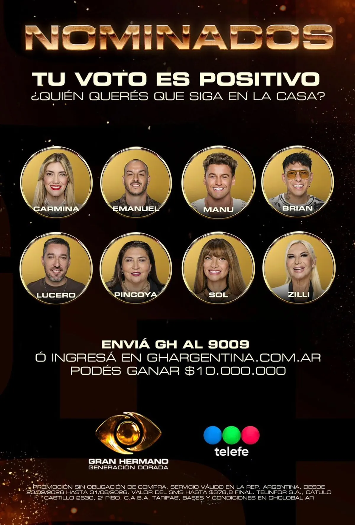 Tras el recuento definitivo, los nominados de la semana son: Carmiña, Emanuel, Manu, Brian, Lucero, Pincoya, Sol y Zilli. El público ya puede votar enviando “GH” al 9009, ingresando a GHGlobal o escaneando el código QR que aparece en pantalla del programa.