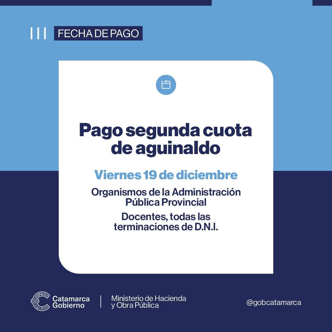 El Ministerio de Hacienda y Obra Pública informó que el 19 de diciembre se realizará el pago de la segunda cuota del Sueldo Anual Complementario para la AdministraciónPública Provincial y Docentes .
