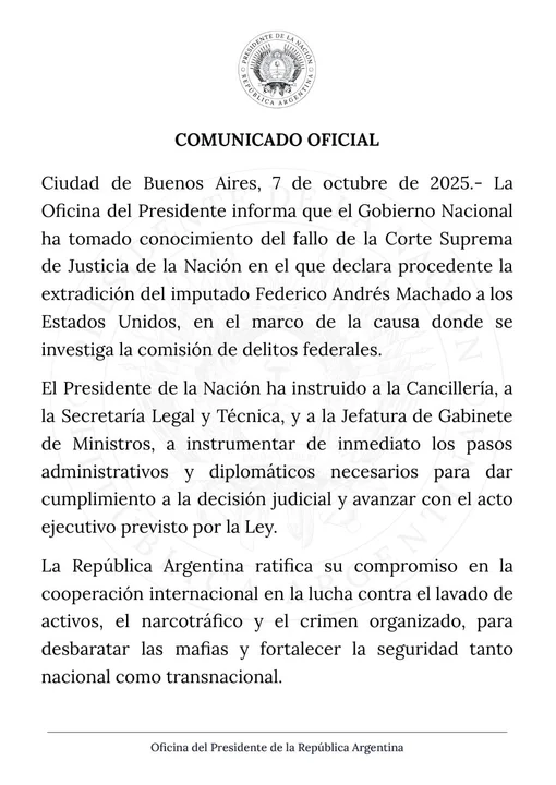 A través de un comunicado, la Oficina del Presidente informó que el jefe de Estado instruyó a la Cancillería, a la Secretaría Legal y Técnica y a la Jefatura de Gabinete a ejecutar de inmediato los pasos administrativos y diplomáticos necesarios para concretar la medida judicial conforme a lo previsto por la ley.
