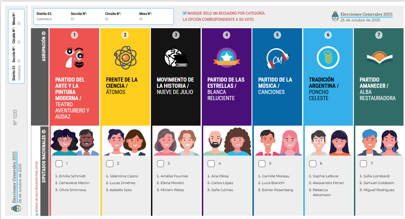 - Sobre la imagen de cada candidato o representantes de los partidos hay un casillero en blanco para marcar y que se pueda elegir a uno por cada una de las categorías.
