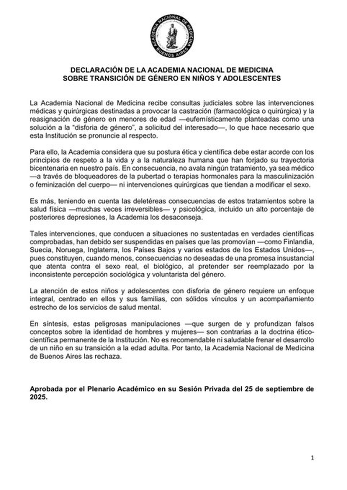 Lo hizo a través de un comunicado emitido tras su Plenario Académico del 25 de septiembre de 2025 en el que rechazó los tratamientos médicos y quirúrgicos de transición de género en menores de 18 años.