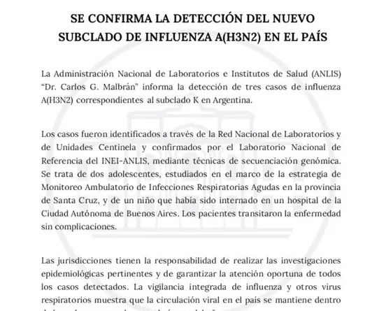 La Administración Nacional de Laboratorios e Institutos de Salud (ANLIS) “Dr. Carlos G. Malbrán” confirmó la detección de tres casos de influenza A (H3N2) correspondientes al subclado K en el país, identificados mediante técnicas de secuenciación genómica.