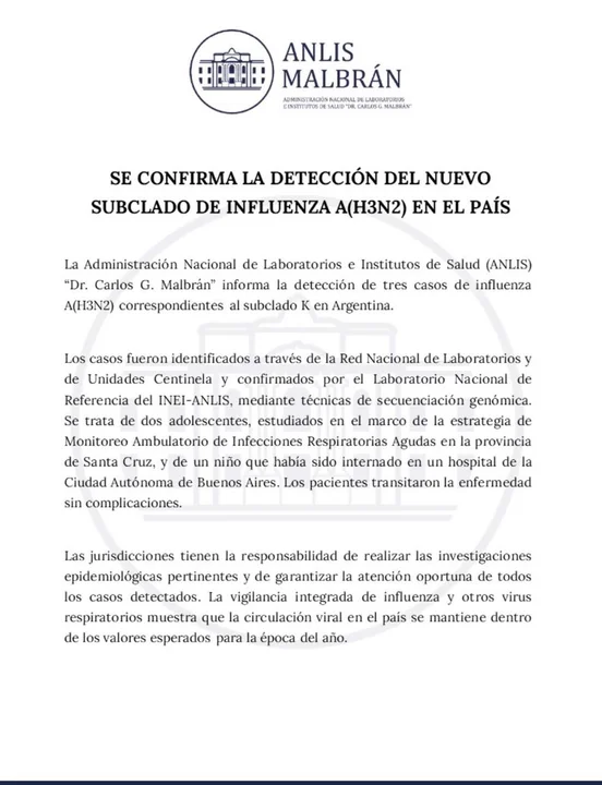 La Administración Nacional de Laboratorios e Institutos de Salud (ANLIS) “Dr. Carlos G. Malbrán” confirmó la detección de tres casos de influenza A (H3N2) correspondientes al subclado K en el país, identificados mediante técnicas de secuenciación genómica.