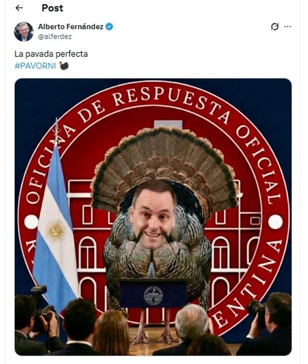 Desde su cuenta personal de la red social X, publicó una imagen editada del jefe de Gabinete, Manuel Adorni, con la cara del funcionario inserta en el cuerpo de pavo, al que señaló de “Pavorni”.