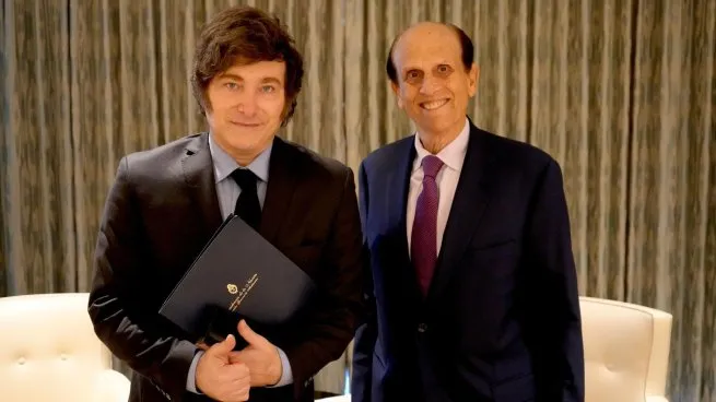 Milei estuvo acompañado por el ministro de Economía, Luis Caputo, y el embajador argentino en EEUU, Alejandro Oxenford. La cita forma parte de la estrategia del Gobierno para atraer inversiones y consolidar vínculos con el establishment norteamericano, especialmente en sectores como energía, finanzas y tecnología.