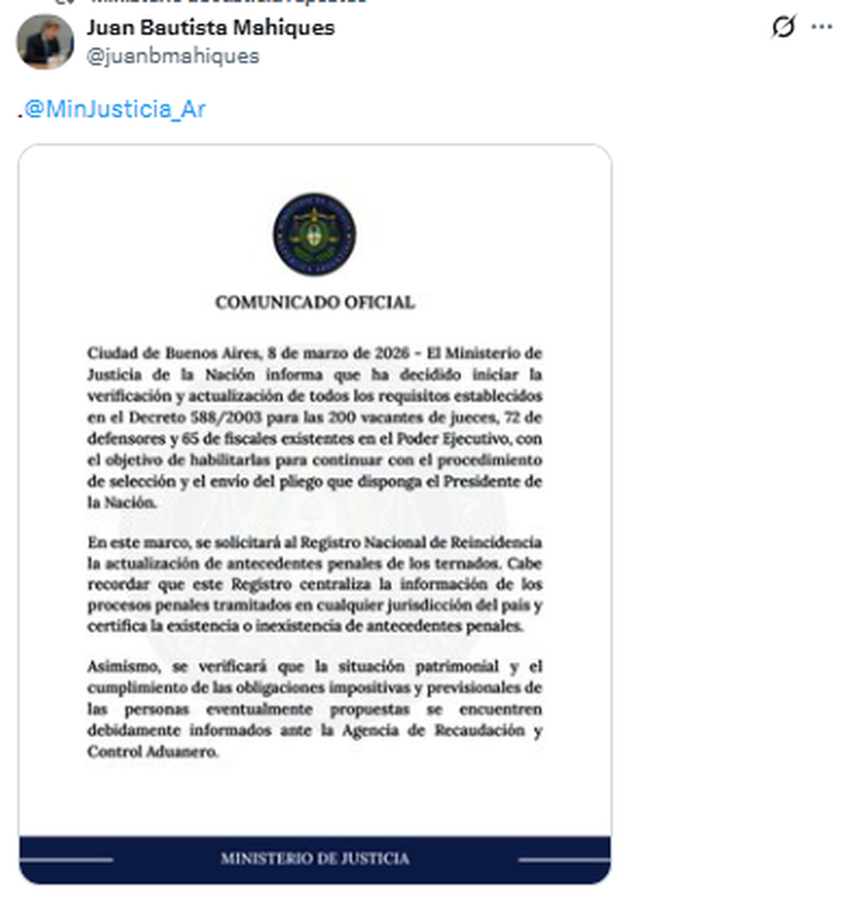 A través de un comunicado difundido en redes sociales, la cartera informó que comenzará el proceso de verificación y actualización de los requisitos establecidos en el Decreto 588/2003, paso necesario para habilitar el envío formal de los pliegos al Congreso.