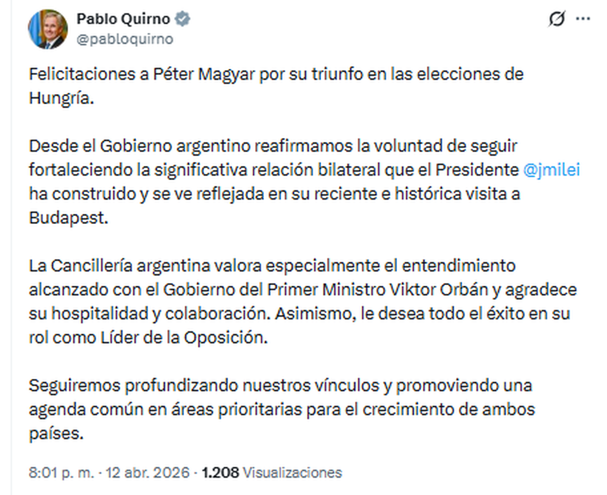 “Felicitaciones a Péter Magyar por su triunfo en las elecciones de Hungría. Desde el Gobierno argentino reafirmamos la voluntad de seguir fortaleciendo la significativa relación bilateral”, expresó el funcionario.