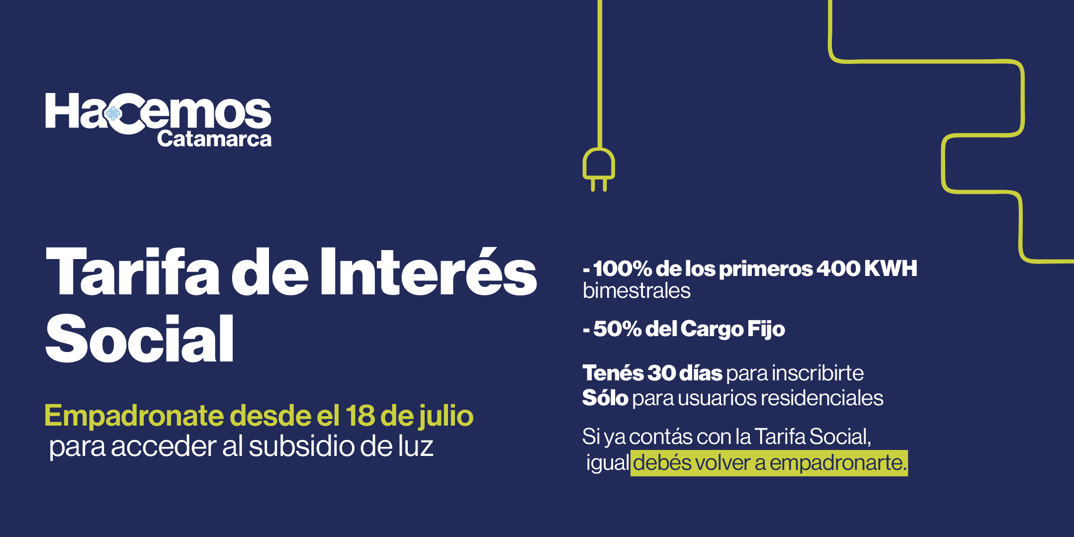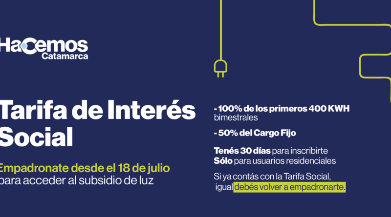 El Gobierno Provincial informa que, el próximo viernes, se pondrá en marcha la campaña para ampliar el beneficio de la Tarifa de Interés Social (TIS) a más catamarqueños y catamarqueñas que ante los permanentes ajustes del Gobierno nacional en materia energética ven afectada su economía hogareña.