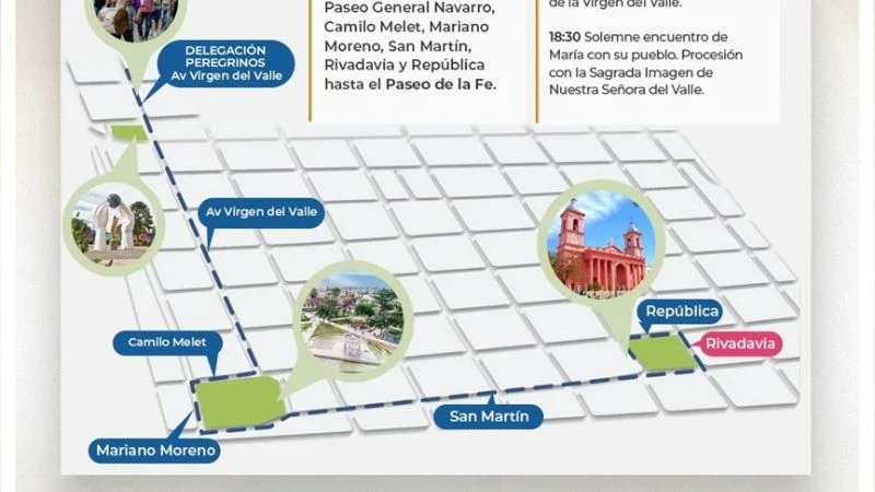 A las 18.30 se comenzará el desplazamiento de la Imagen de Nuestra Señora del Valle en la Solemne Procesión, cuyo recorrido comprenderá avenida Virgen del Valle hacia el sur hasta el Paseo General Navarro o La Alameda, continuando por Camilo Melet, Mariano Moreno, San Martín, Rivadavia y República hasta el Paseo de la Fe.